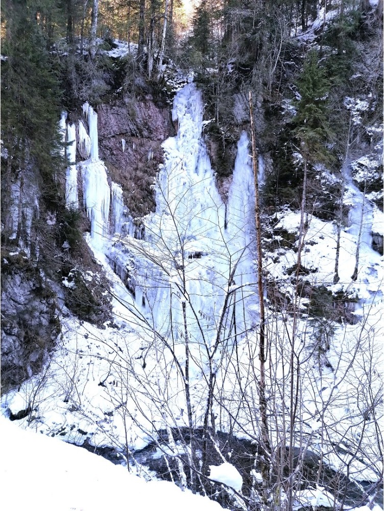 Vom Bahnhof aus folgen wir der Straße, vorbei an der Kapelle, die der Heiligen Maria Magdalena gewidmet ist. Wir gehen weiter über Felder und steigen dann hinab zur Brücke Pontet, wo wir einen herrlichen Eisfall bewundern können. Wir steigen wieder auf den Alpenweg hinauf, auf dem früher der Käse aus dem Greyerzerland nach Frankreich transportiert wurde. Am rechten Ufer des Hongrin können wir den Dent de Jaman bewundern.